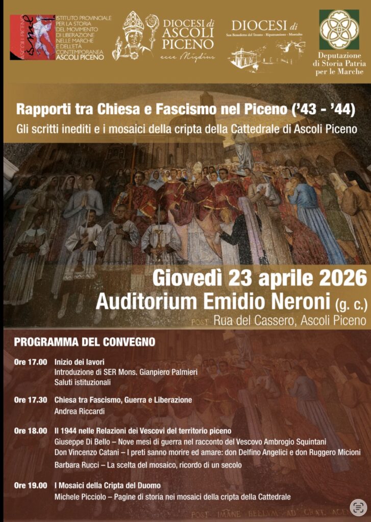Al convegno, organizzato dalla Diocesi ascolana e dall’ISML locale, svoltosi giovedì 23 aprile ad Ascoli Piceno, ha portato il saluto dell’ANPI il vicepresidente provinciale vicario Davide Falcioni, il quale ha ricordate alcune figure di sacerdoti distintisi nella lotta di Liberazione. In particolare, è stato ricordato il ruolo di don Sante Nespeca, a Castel di Croce, attivo nella banda Paolini che operava nella zona. Don Sante Nespeca risulta altresì eletto nel primo comitato provinciale ANPI di Ascoli Piceno, formatosi il 22 dicembre 1944.