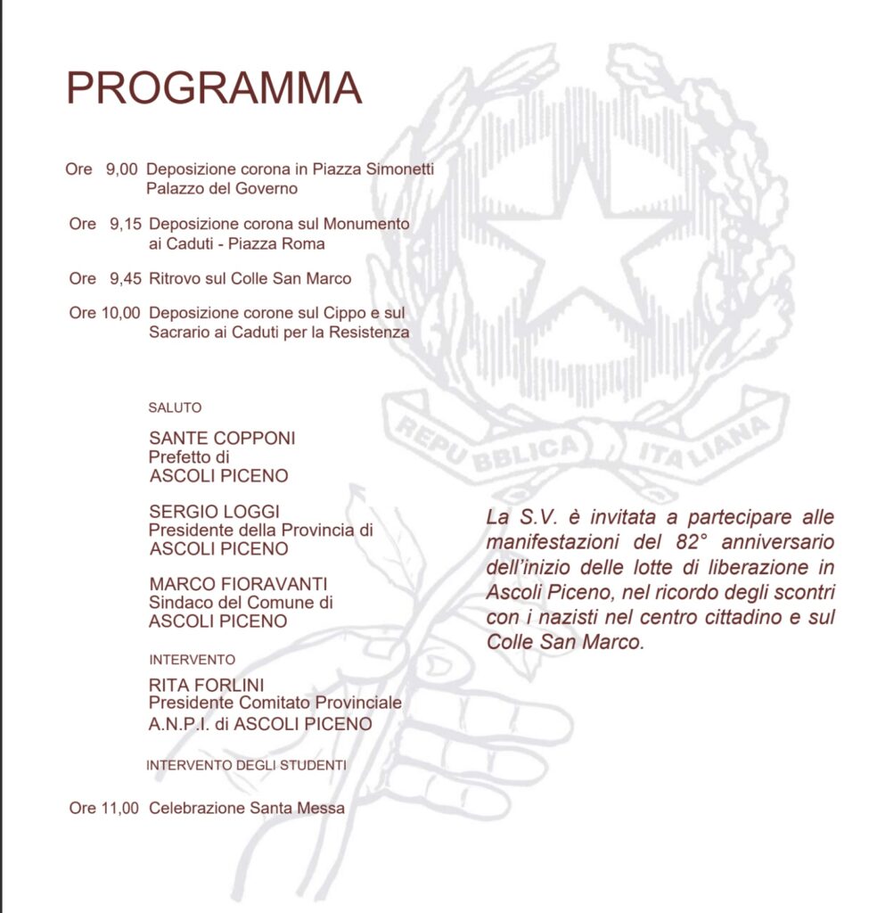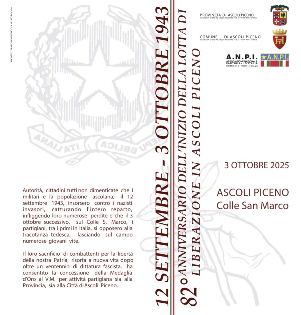 L’Anpi provinciale di Ascoli Piceno, insieme alle associazioni d’armi, alle istituzioni civili, militari e religiose, celebra il prossimo 12 settembre, alle ore 9,30, presso il sottopasso ferroviario in via SS. Filippo e Giacomo, l’82° anniversario degli scontri che, il 12 settembre 1943, videro la popolazione ascolana e i primi nuclei di resistenti opporsi con coraggio alle truppe tedesche.