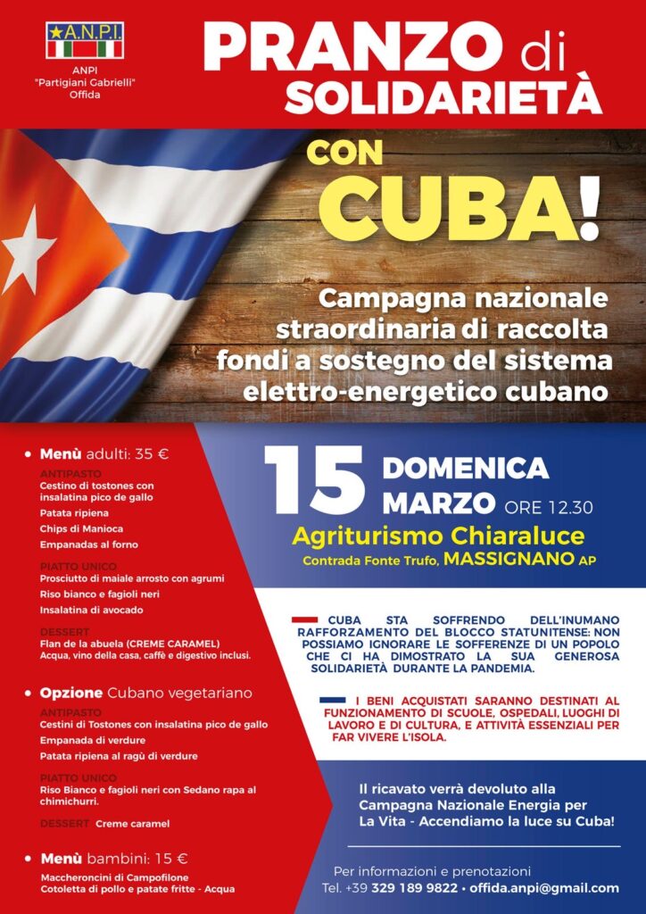 È giunto il momento di sostenere Cuba e di lanciare un programma straordinario di raccolta fondi a sostegno del sistema elettro-energetico per l’acquisto di prodotti, attrezzature e altri supporti tecnici per il funzionamento dei pannelli solari.